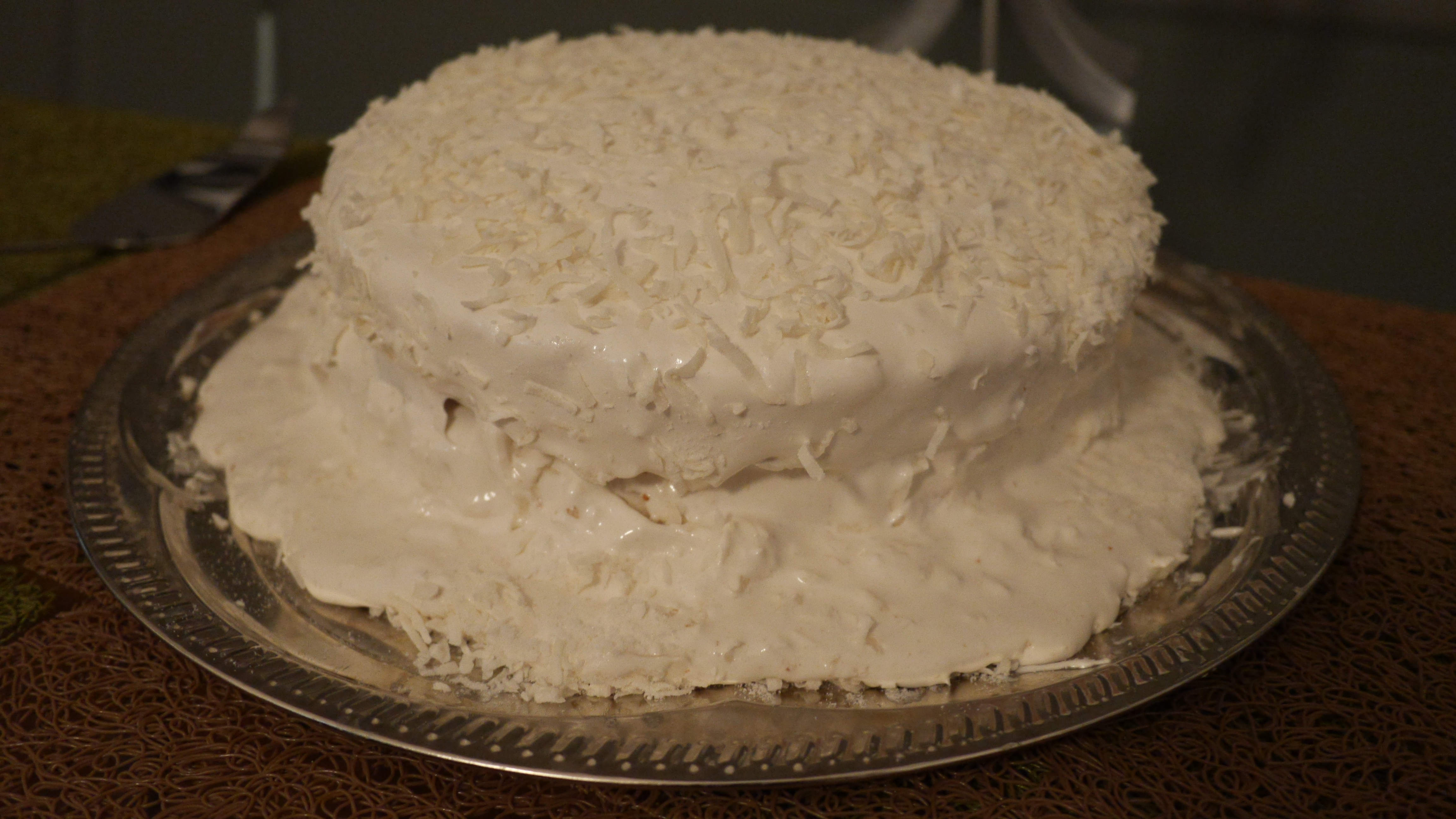 2. Continue beating until frosting is firm enough to hold when spread on cake. Frost cake then sprinkle immediately with grated coconut, pressing coconut onto sides of cake with hands.