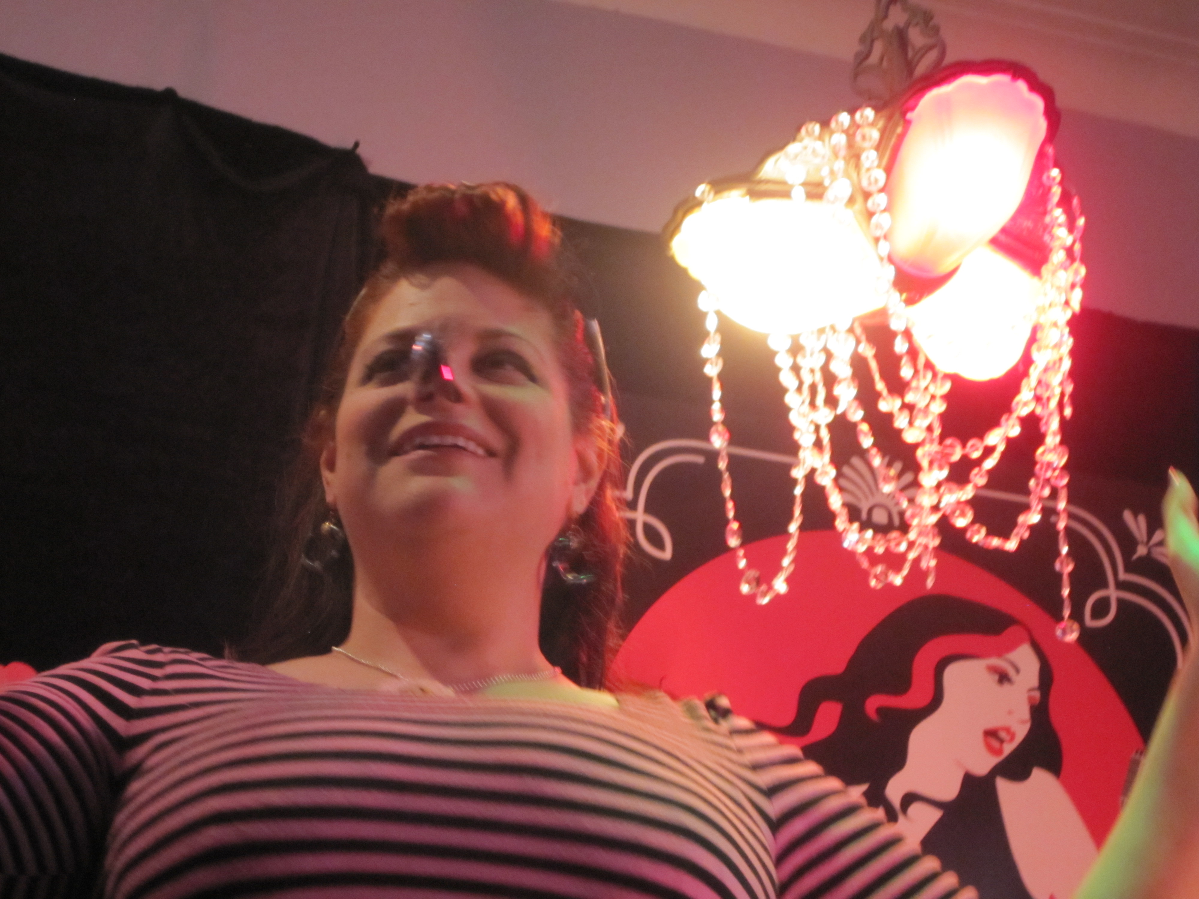 Returning to our stage, the always amazing, noted wit and pain-proof woman, The Lady Aye, will be freaking us the frak out with some of her sideshow skills and sharing the equally fantastic stories behind how she got to be the “Sweetheart of the Sideshow” and also interview Margaret Cho for Playboy magazine and her thoughts on WTF happened on American Horror Story Freak Show. Clearly, lots to discuss. Here is a photo from last time she visited us for Valentines Day, she stuck some spoons in her nose, as you do.